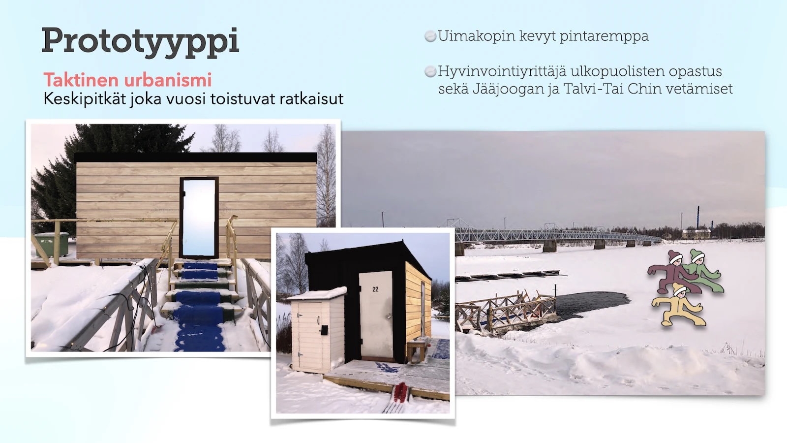 Tehtävä oli opiskelijatyö, jolla pyrittiin kehittämään talviulkoilua. Tässä tehtävässä tavoittelin avantouintiharrastuksen viipymää ja yhteisöllisyyttä. Lopputuotokseksi laadin konseptin, jota saattoi testata kevyesti ja edullisesti lyhyellä sekä keskipitkällä aikavälillä. Testausten perusteella pystytään rakentamaan myös pysyviä muutoksia alueelle. Konsepti laaditiin yhteiskehittämällä yhdessä käyttäjien kanssa.